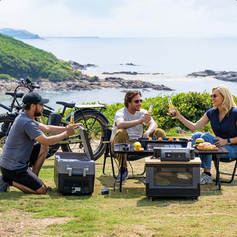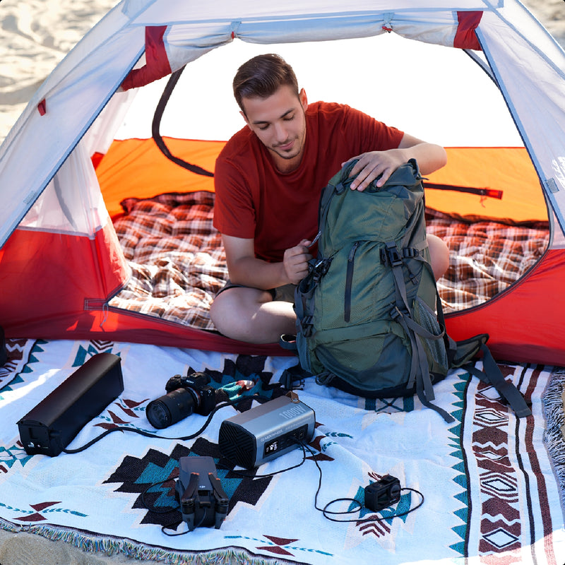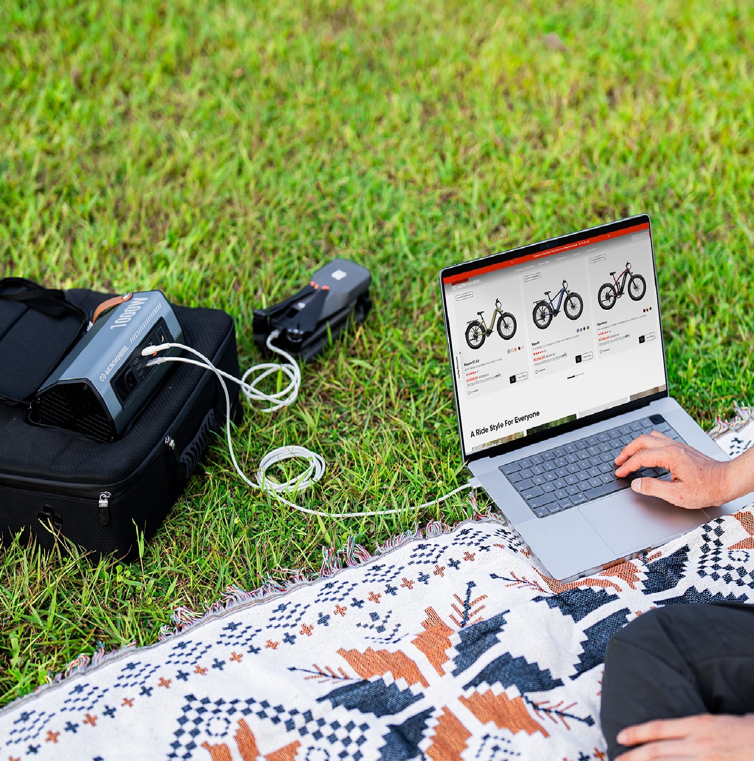 The portable inverter is your energy hub-directing power from your e-bikebattery to your devices, and with solar input, back into your bike.