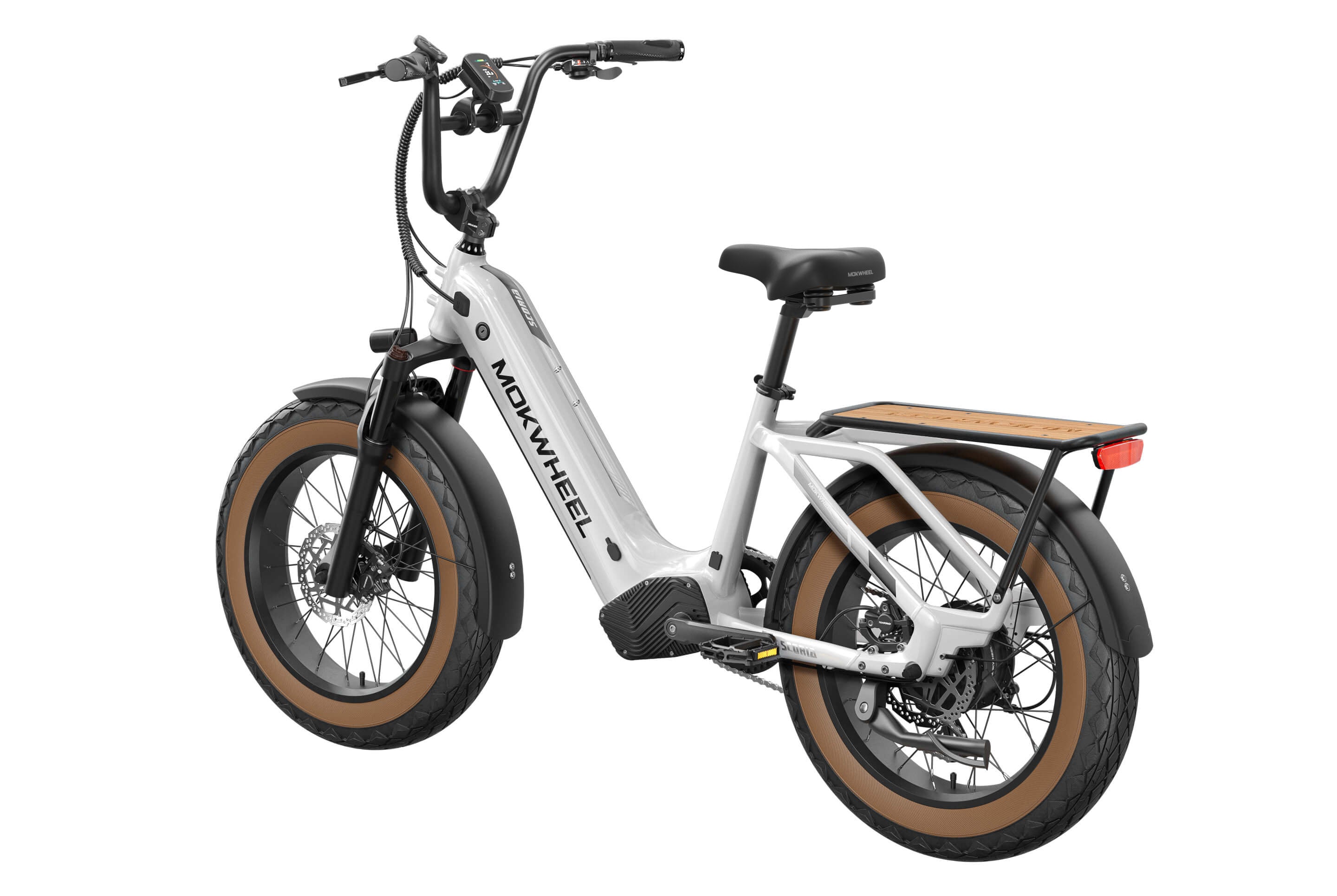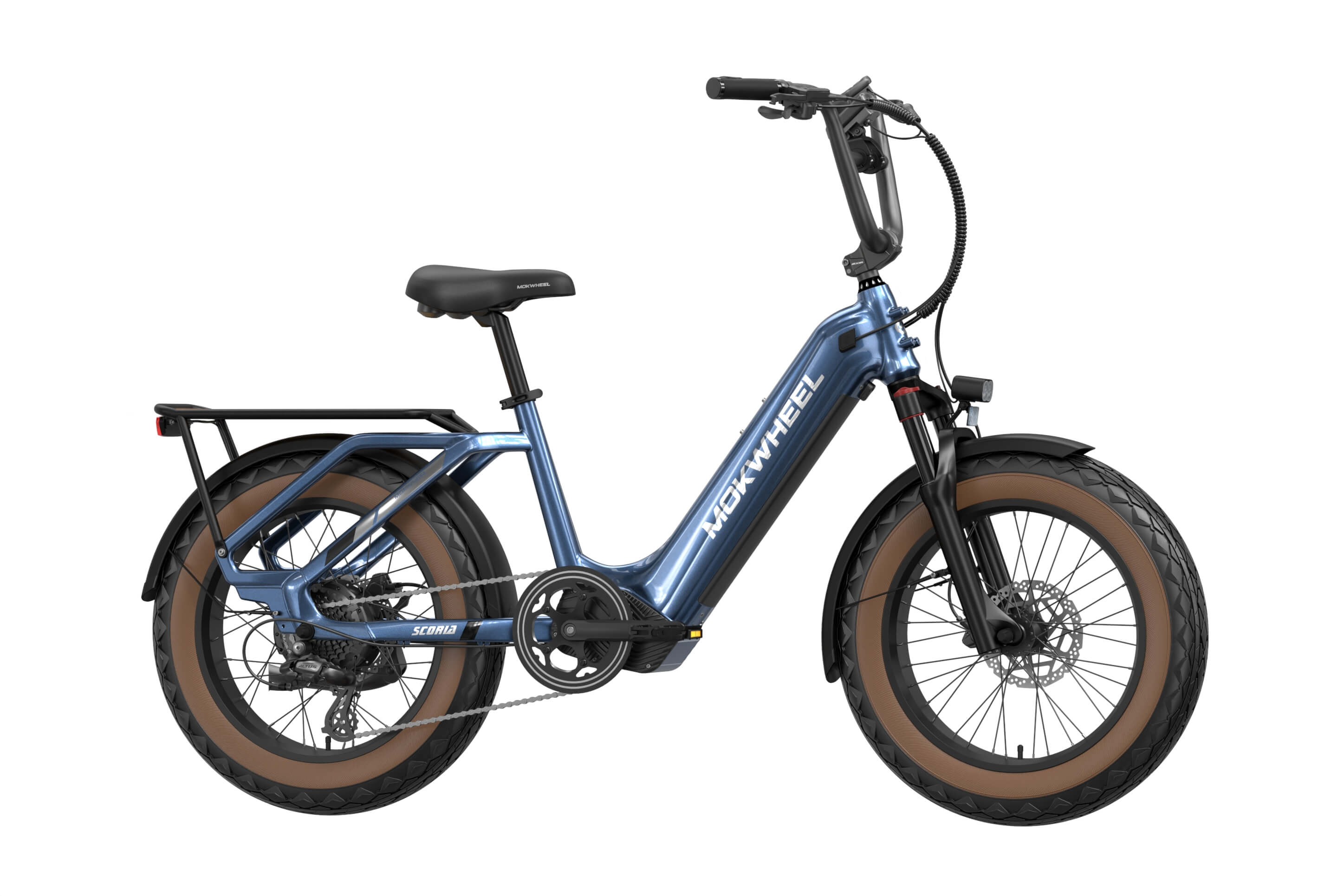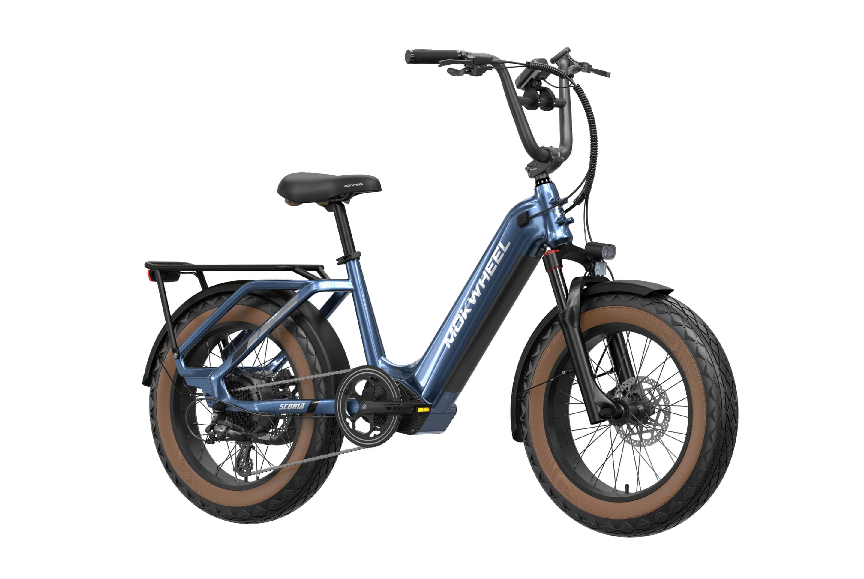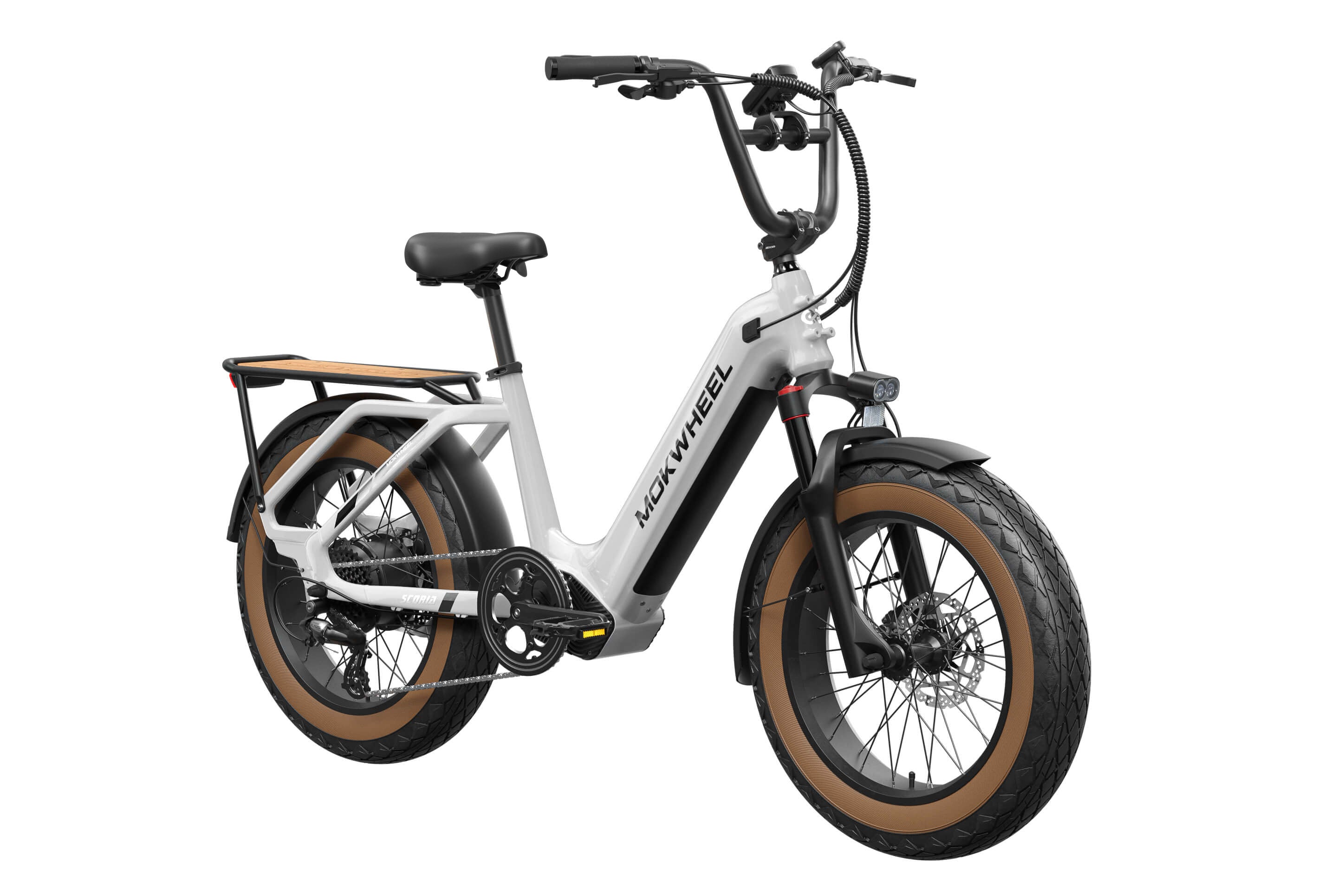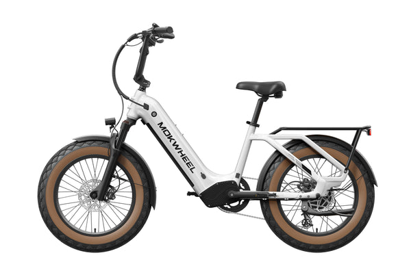 The Scoria 3.0 is a compact cargo e-bike from Mokwheel, designed for stability, practical use, and versatile everyday applications. Its 250W motor paired with a 48V 19.6Ah battery delivers strong performance and long range. The 20×4.0-inch wide tires and low-step frame make it easy and safe to handle for riders of different heights. Equipped with hydraulic brakes, a reinforced frame, and an integrated rear cargo platform, the Scoria 3.0 is ideal for transporting gear, running daily errands, family rides, and maneuvering in tight urban spaces. Compact, powerful, and easy to operate — a perfect choice for riders seeking a small-format e-bike without compromising performance.