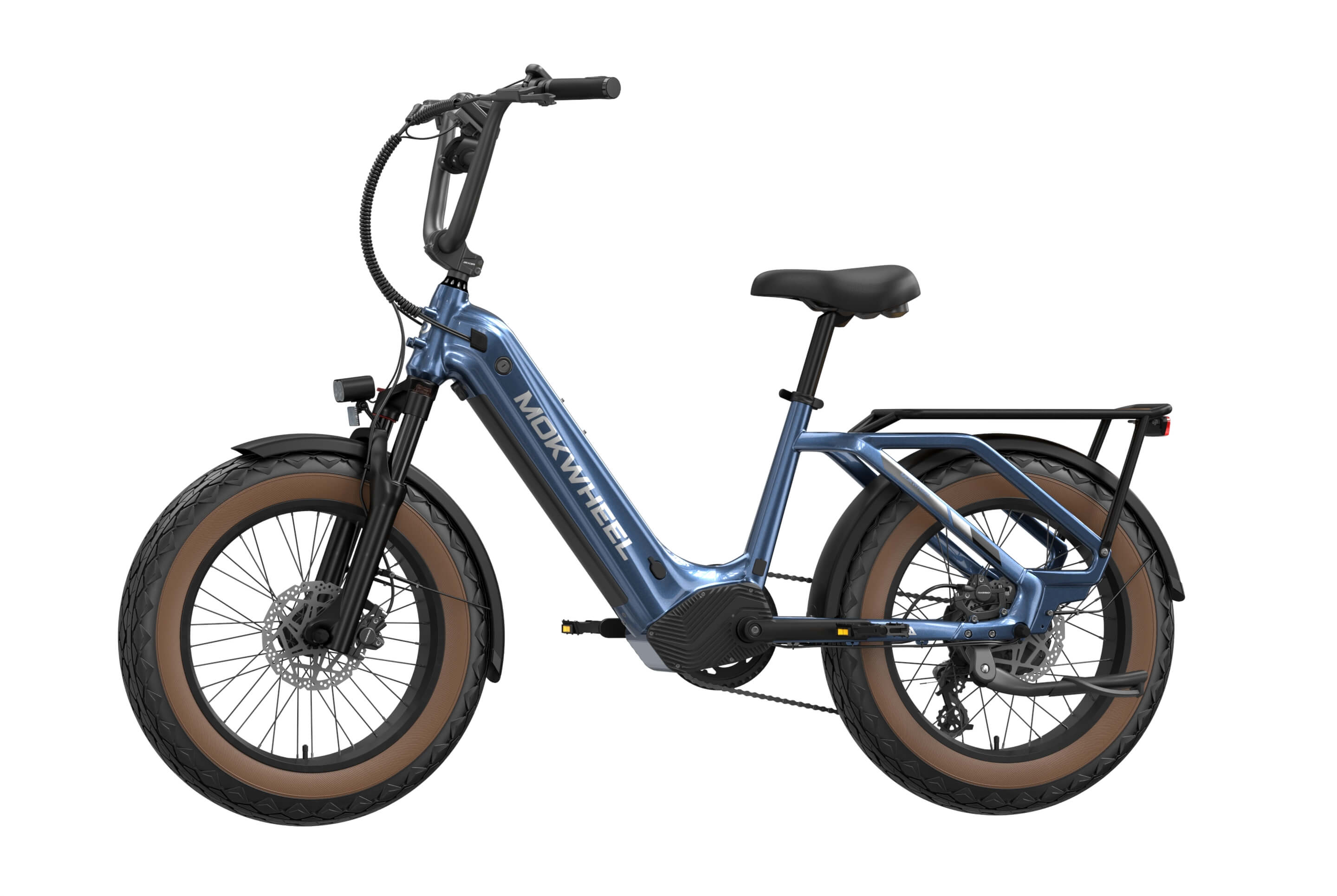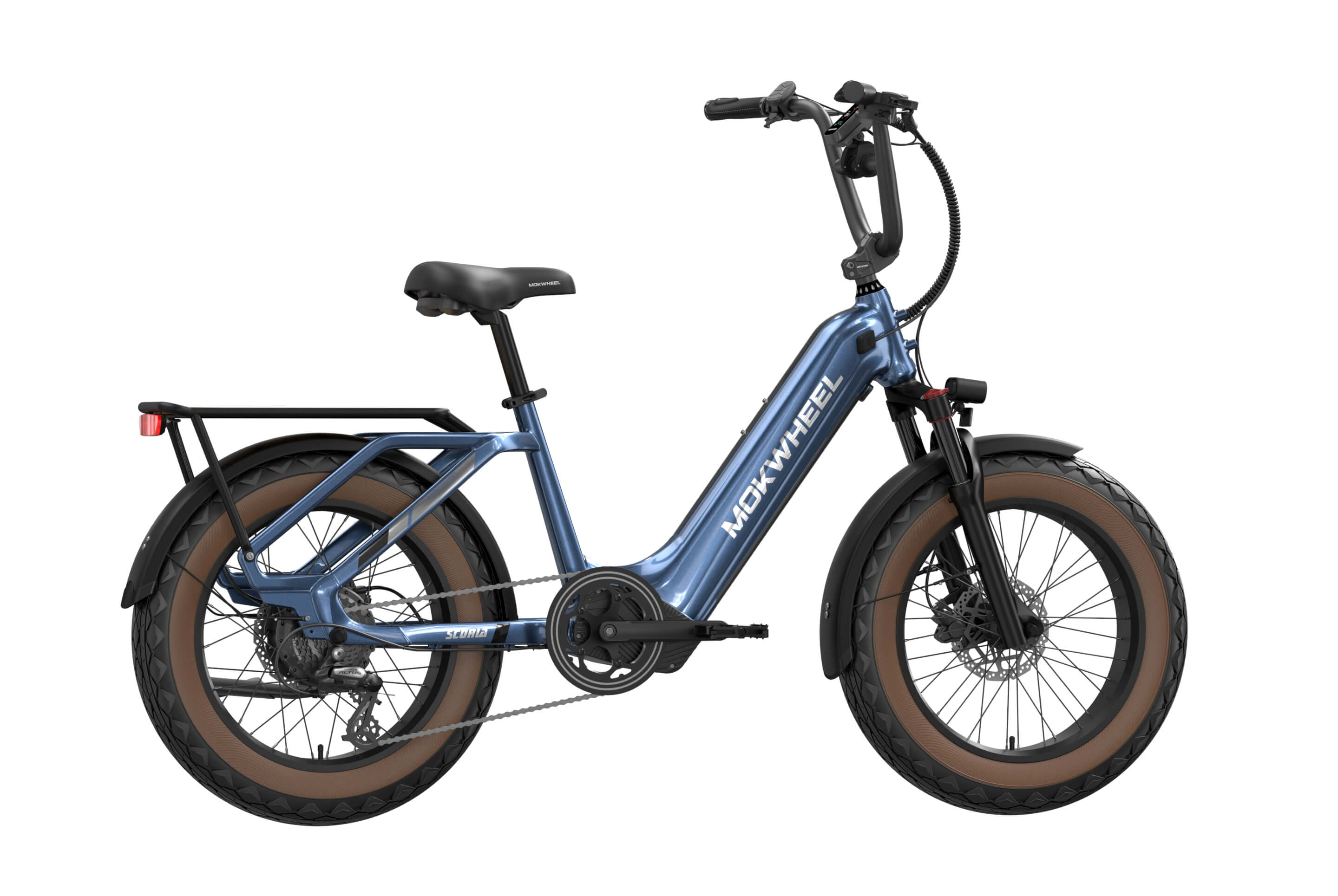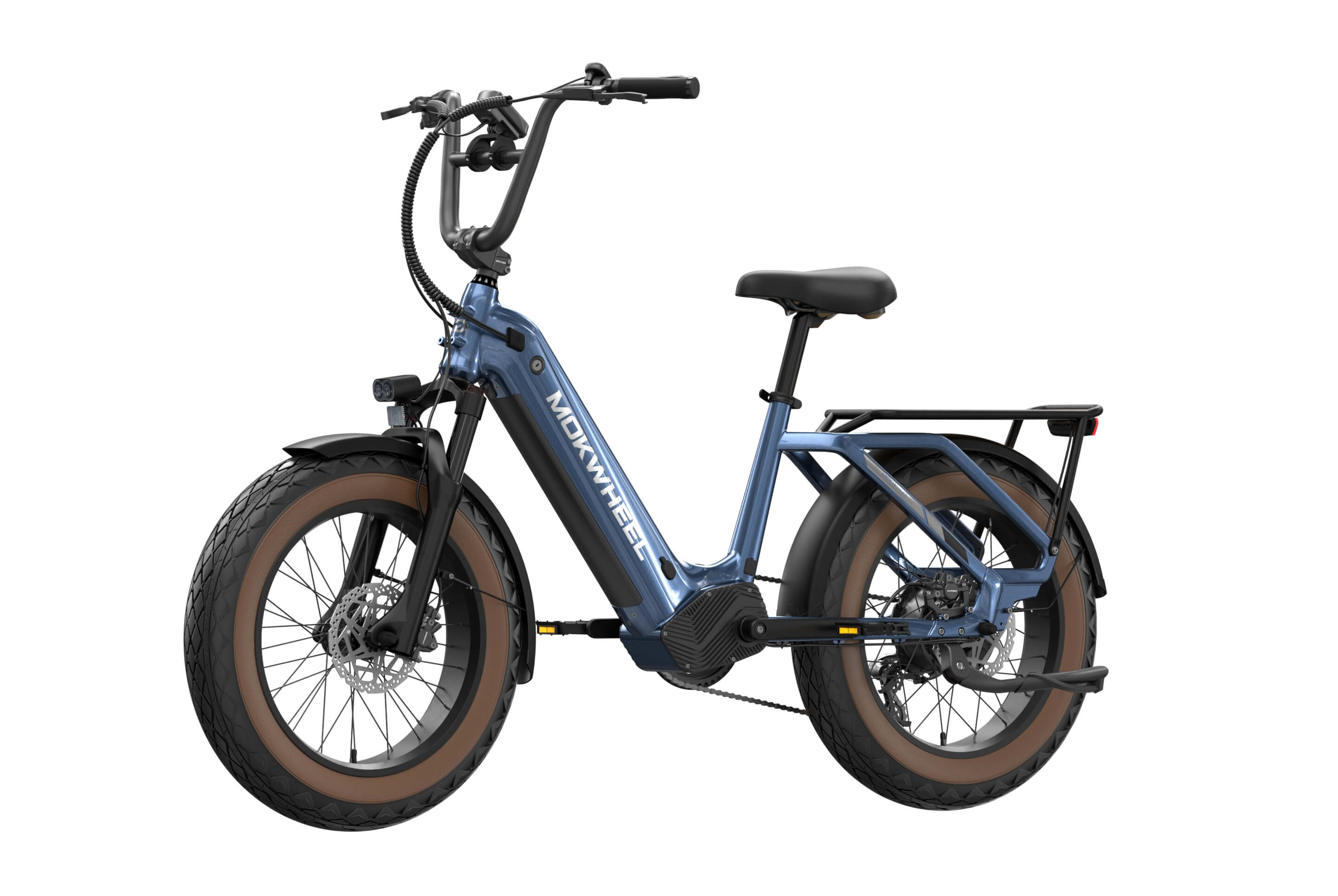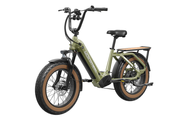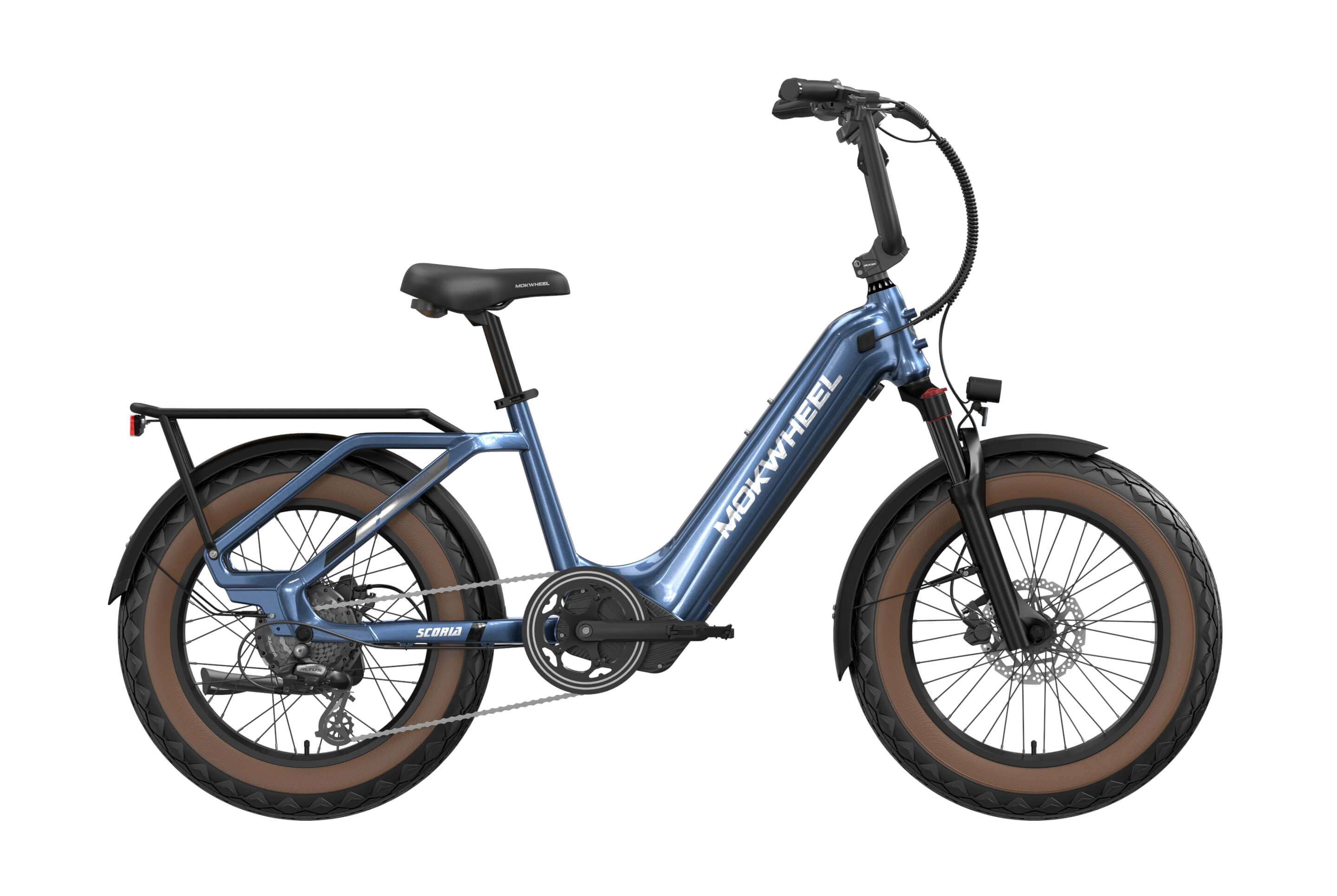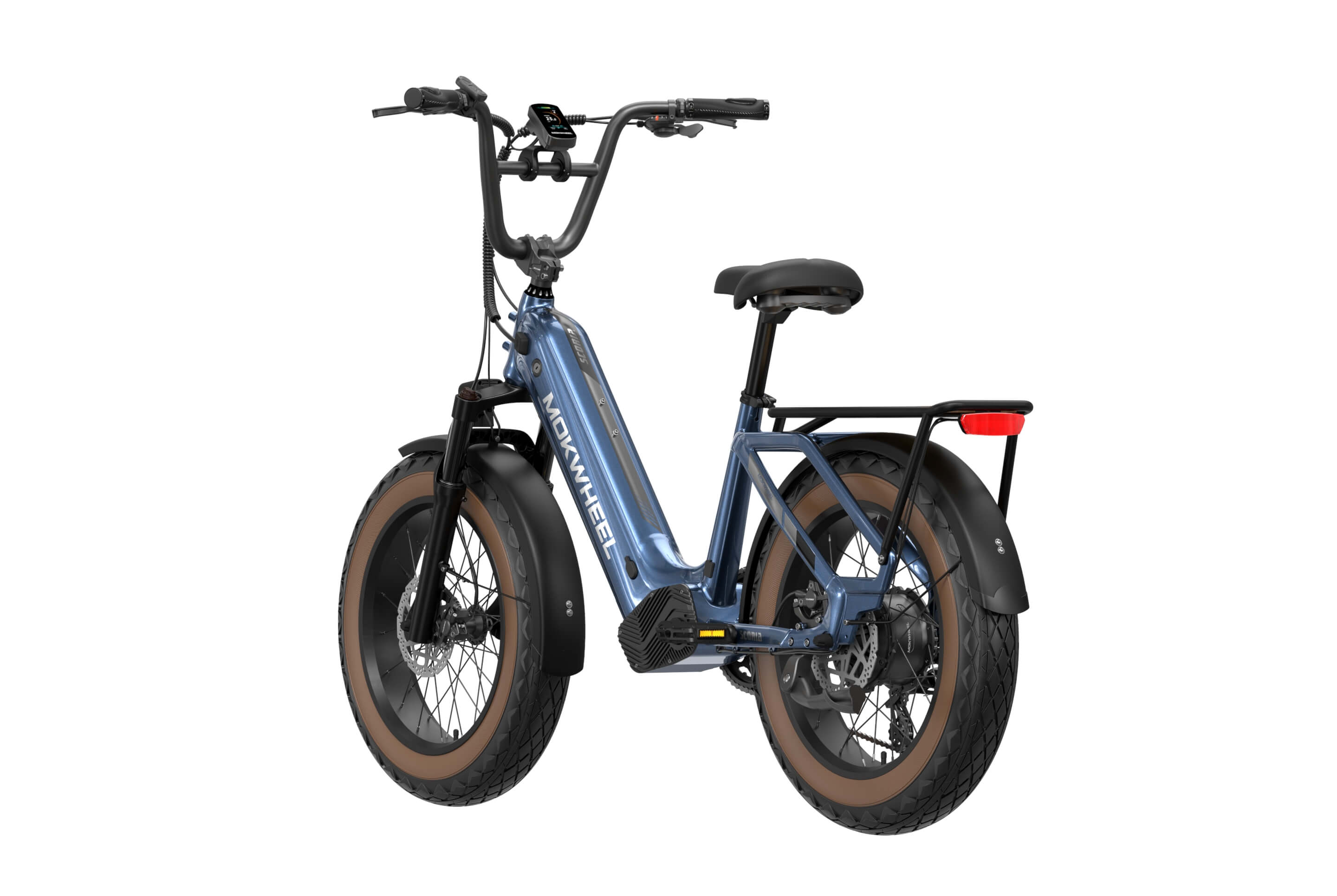 The Scoria 3.0 is a compact cargo e-bike from Mokwheel, designed for stability, practical use, and versatile everyday applications. Its 250W motor paired with a 48V 19.6Ah battery delivers strong performance and long range. The 20×4.0-inch wide tires and low-step frame make it easy and safe to handle for riders of different heights. Equipped with hydraulic brakes, a reinforced frame, and an integrated rear cargo platform, the Scoria 3.0 is ideal for transporting gear, running daily errands, family rides, and maneuvering in tight urban spaces. Compact, powerful, and easy to operate — a perfect choice for riders seeking a small-format e-bike without compromising performance.